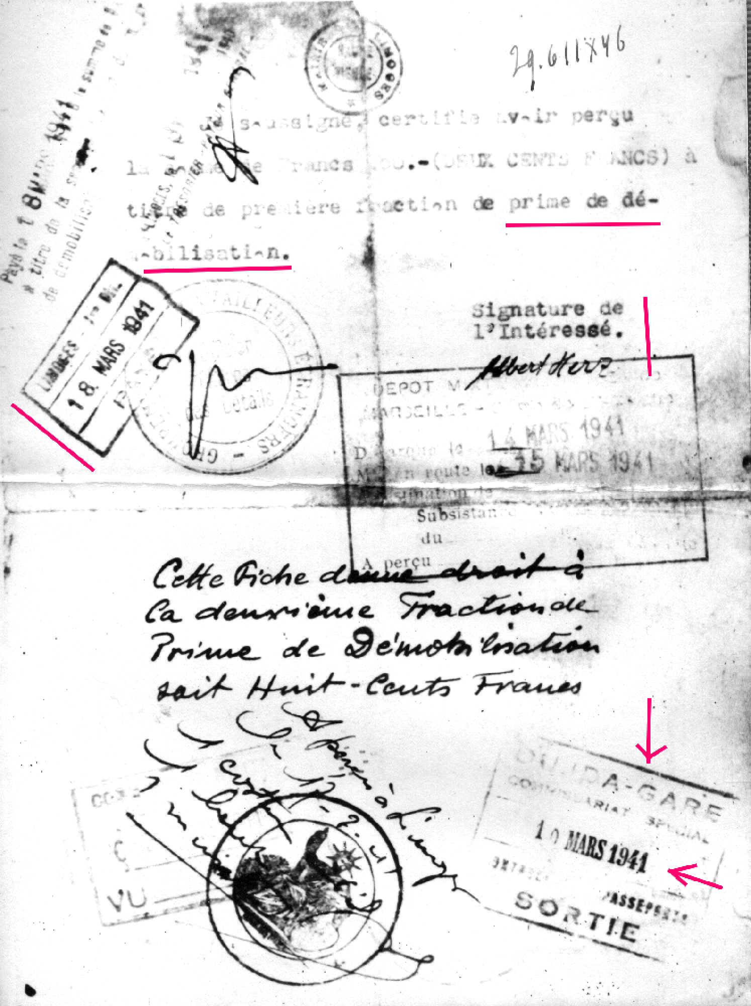 A message from Fez, dated December 1940, on the back of a picture of Albert Herz reads "To my dear Cora and my tiny, precious child [Arlette-Herz]". From pages 2 and 3 of his French Foreign Legion booklet we learn that on 1941.03.08 Albert Herz was being demobilized and that he was going to Limoges (which was still in the "Zone Libre" under the Vichy government) and that on 1941.03.18 he received his pay in Limoges.