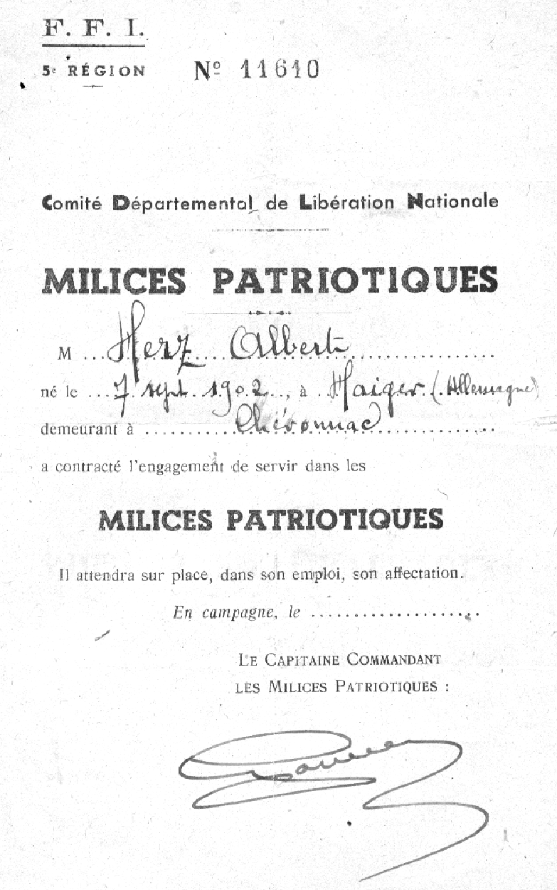 We know that Albert Herz was active in the Resistance, and apparently was involved in spotting allied paratroopers. An open question is whether he was involved in the interrogation of German prisoners. He was issued a false identity card under the name Albert Durand, and a card, unfortunately without a date, showing that he was a member of the Milices Patriotiques.
